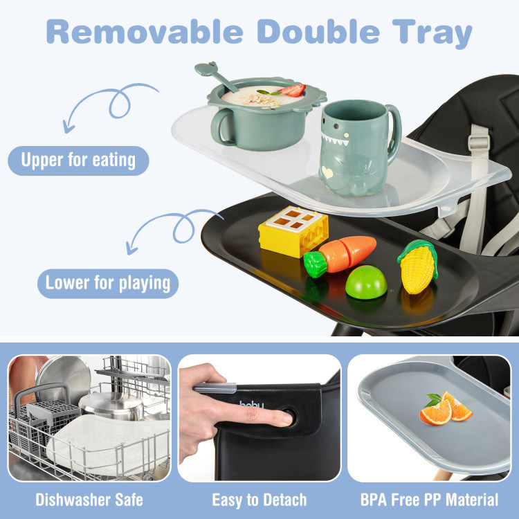 2.Removable Double Tray: This infant feeding chair is equipped with a double tray that can be easily removed according to your needs. The upper tray is suitable for eating and feeding, and the lower tray is ideal for playing. The tray is made of BPA free PP material and harmless to the health of your baby.