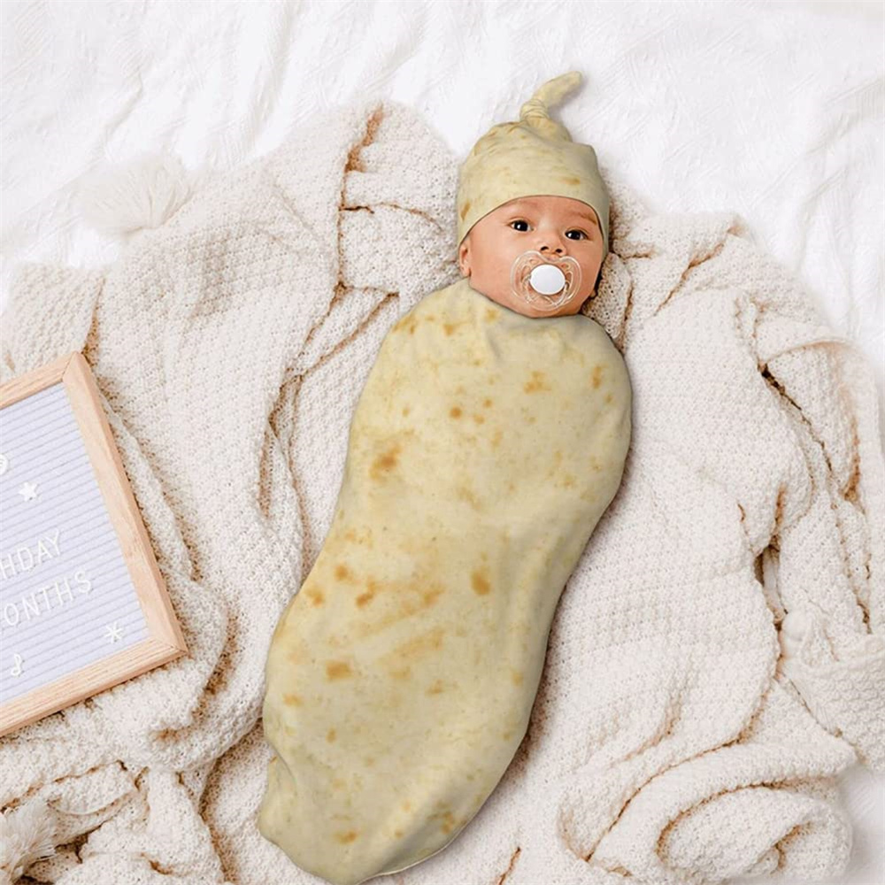 1.Baby Wrap Burrito Swaddle Blanket Set: This adorable set includes a newborn burrito wrap blanket and a baby hat. When wrapped up, your baby will resemble a cute little chipotle burrito in this tortilla blanket.