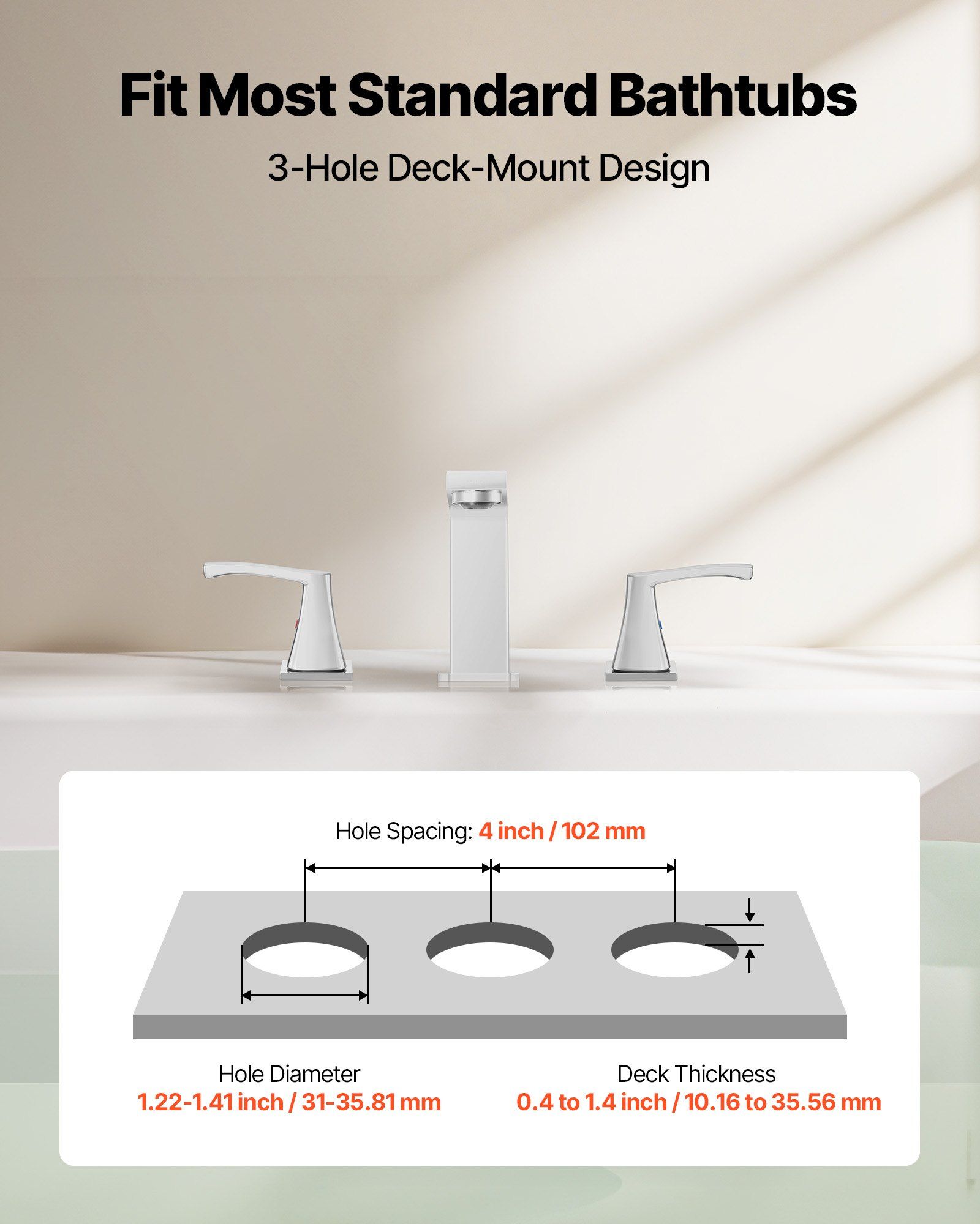 2.Universal 3-Hole Design: This widespread roman tub faucet includes a 3-hole mounting design that fits the majority of bathtubs. Hole sizes range from 1.22 to 1.41 inches (31 to 35.81 mm), with deck thickness between 0.4 and 1.4 inches (10.16 to 35.56 mm), making installation straightforward and reliable
